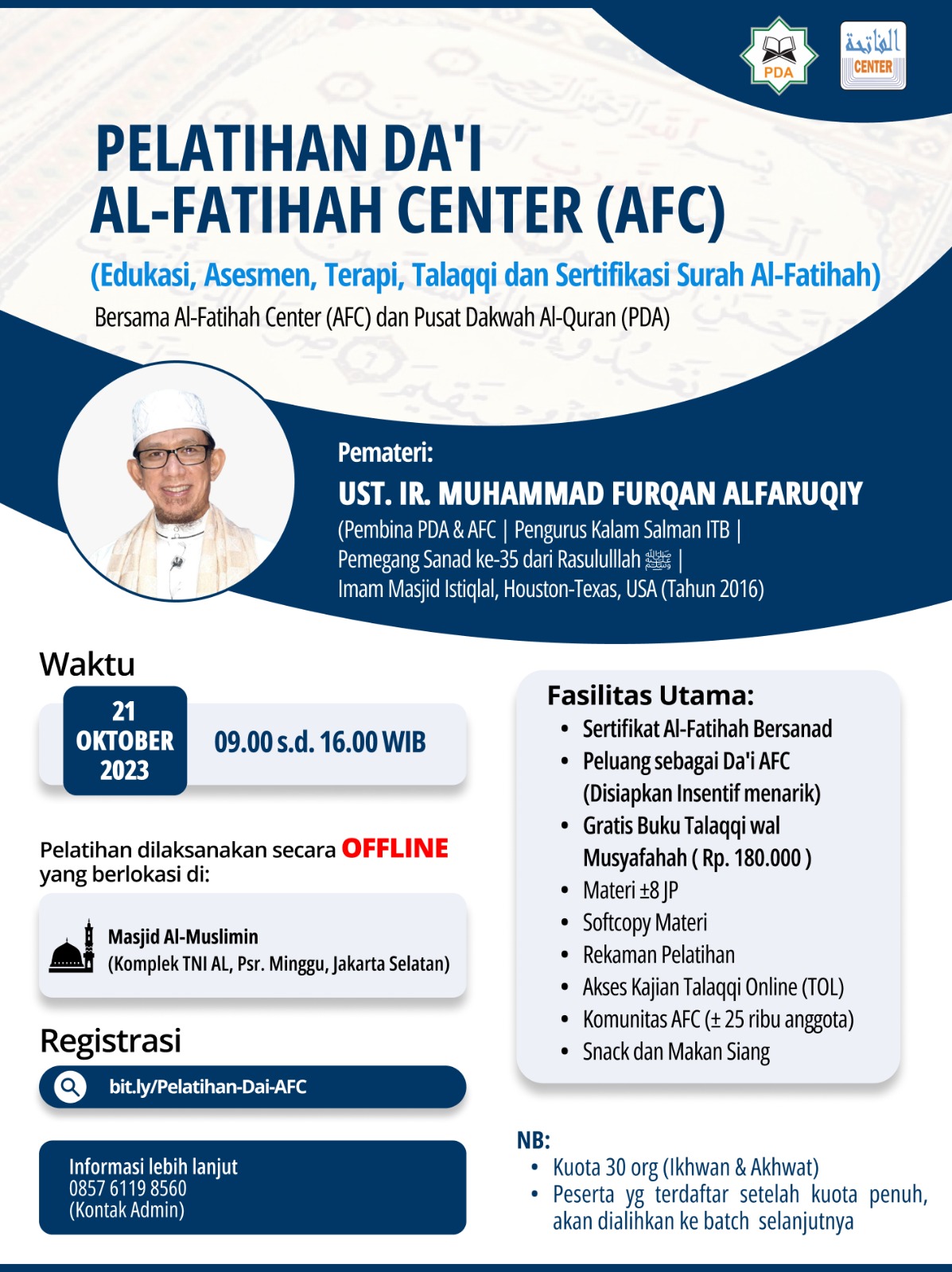 Al-Fatihah Center mengundang Anda untuk bergabung dalam Pelatihan Da’i Al-Fatihah – program pembinaan bagi para pegiat dakwah yang siap terjun ke tengah masyarakat untuk mengajak, memotivasi, dan mendampingi umat agar merekam dan memperbaiki bacaan Al-Fatihah mereka.